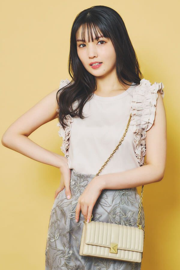 骨格ウェーブが得意なのは①柔らかくハリが出すぎない生地感、②体にフィットするタイトなサイズ感、③盛れる甘めディテール付き! たっぷり盛り付けたフリルで甘く華やかに見せつつ、上半身の貧相見えを防止。