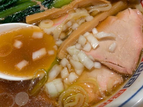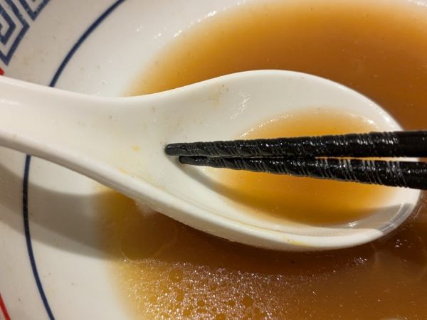 着丼したラーメンのスープは、醬油ベースで透き通っています。メンマがたっぷりなのも、中華そば王道のビジュアル。