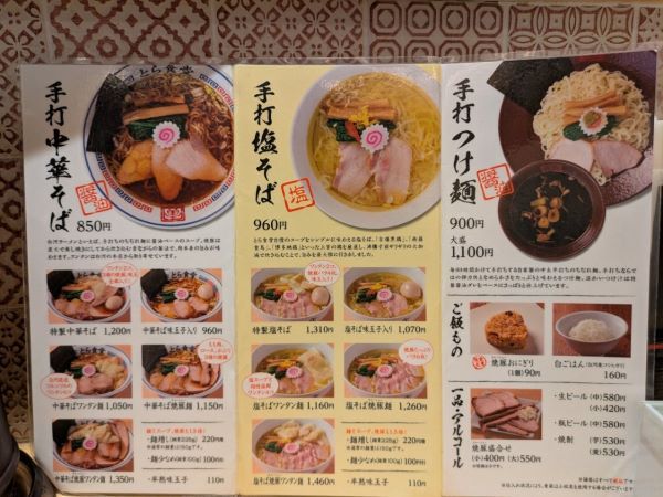 ラーメンは大きく「手打中華そば」「手打塩そば」「手打つけ麺」の3種類。ワンタン(白河の本店から直送)や半熟味玉子入り、サイドメニューとして「焼き豚おにぎり」と「白ごはん」があります。