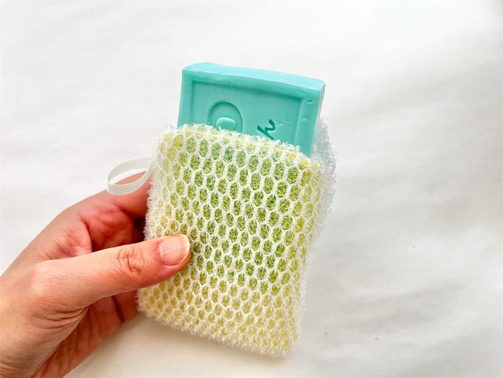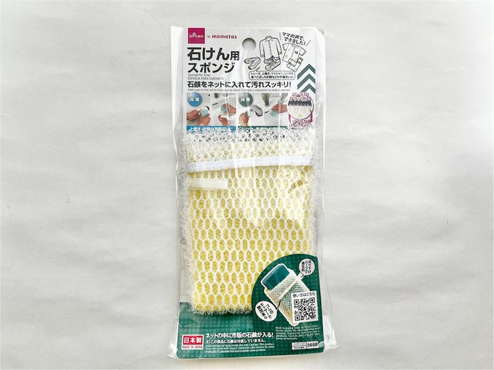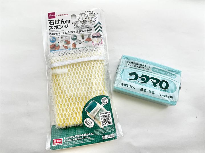 「石けん用スポンジ」は、市販の石けんをすっぽり入れられるネット状のスポンジです。ウタマロがぴったり入って、まるで洋服を着ているよう♡