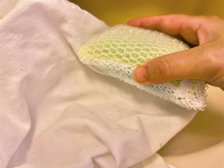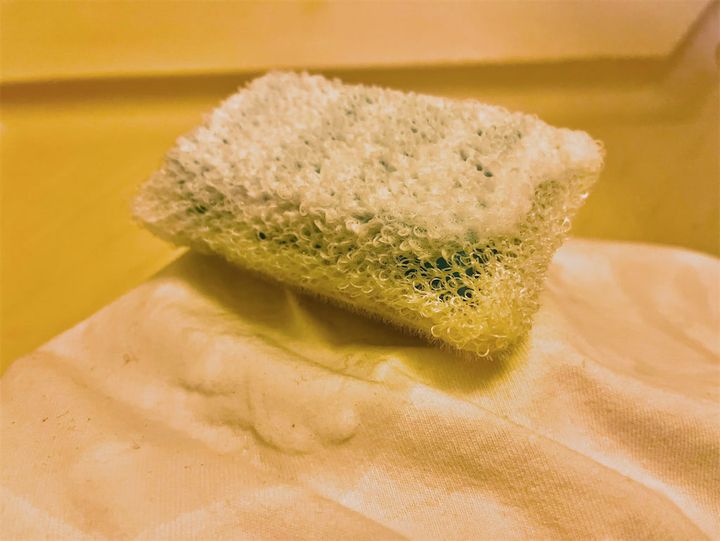 ウタマロをスポンジのネットに入れ、パイル面でやさしくこすってみると…