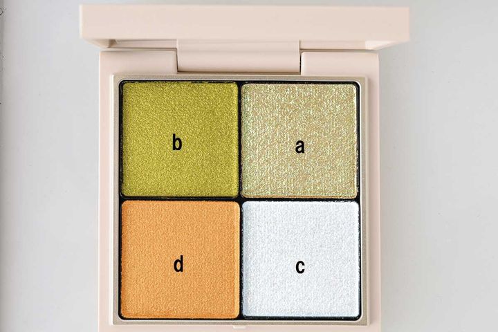 【アイ】aをアイホール広めに指でのばし、目頭1/3にbを。涙袋にcを、下まぶたの目頭にdを重ねる。bとdで目頭に色を足して求心顔に。まつ毛は1を上下に1度塗り。