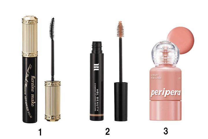 1ヒロインメイク リアルラッシュマスカラ アドバンストフィルム 01 ¥1,540 /KISSME(伊勢半)2 HBL アイブロウ カラーリングマスカラ 01 ¥3,300/HBL BEAUTY 3 ペリペラ シロッピートックチーク 01 ¥1,540