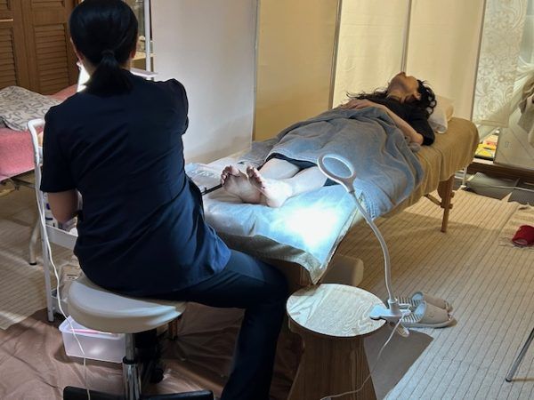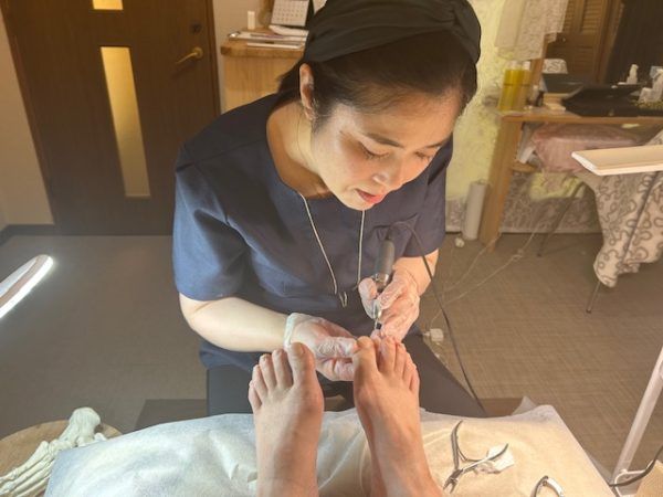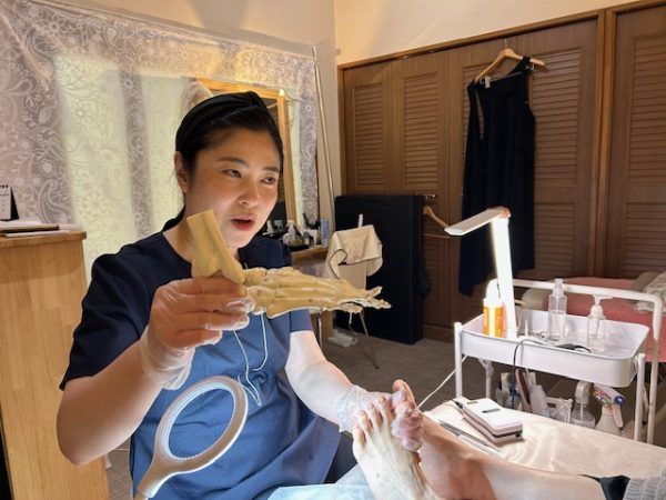 お話を伺っていると、足と爪に対する情熱がすごい。単にサロンでの爪切りやお手入れだけではなく、介護現場や病院での爪切りやフットケアの重要性を熱く語られていました。これからの高齢化社会、健康で痛みのない足で歩けることは大事ですよね。 現在、昼間は看護学校に通って資格を取るべく勉強しているそうです。営業時間が不規則になっているのはそのためです。