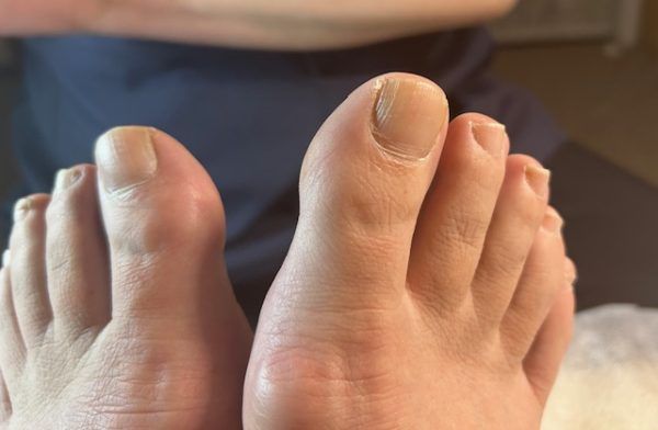 毎日元気に歩いているわたしの足ですが、少々打ちのめされました。(自覚はちょっとありました)まず爪が肥厚爪。これは長年の靴の圧力によるもの。そして少々外反母趾気味。若い頃はパンプスばかり履いていましたから。そのせいで中指・薬指・小指は親指がわに寄っていて爪も曲がっています。自分でも曲がっていて切りにくいなあと思っていました。1本だけ重複爪!重複爪はお手入れ次第で改善するそうです。