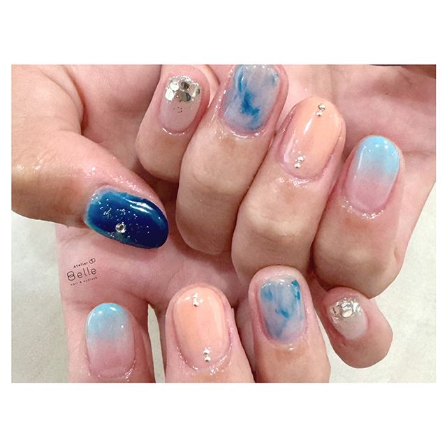 【爽やか夏ネイル】ブルーのグラデーションにミルキーオレンジがポイント
