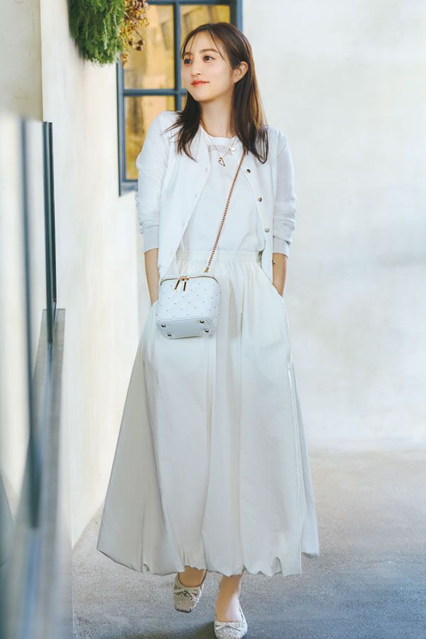 今季はアンサンブルニットがトレンドアイテム。同じようにトレンド感の高いバルーンスカートと合わせたオールホワイトコーデは鮮度抜群の最旬ルック。スカートのトレンド感を引き立てながら、コーデを品よくまとめるのがアンサンブルの醍醐味です。