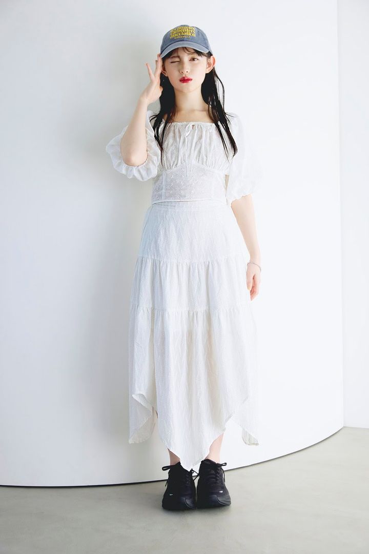 ガーリーなホワイトのセットアップには、あえてボリューミーな黒のスニーカーを。ツヤを抑えたマットな質感が、大人色リップと好相性!