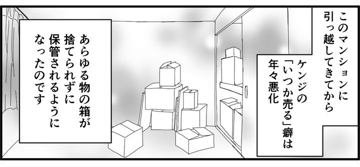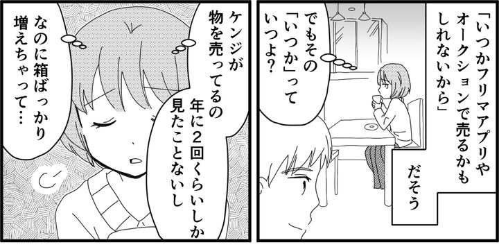 ケンジは「いつか売る」と何でも箱を保管するのですが、実際には年に数回しか物を売りません。箱は増え続け、子ども部屋予定だった部屋も箱用の部屋に。ケンジの「いつか売る」病は困ったものです……。