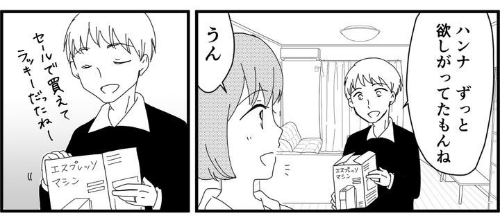 私はエスプレッソマシン購入に浮かれつつも、ケンジが箱を丁寧に畳む姿にうんざりしていました。