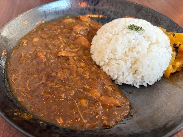 もちっとしたごはんの食感がカレーと相性抜群!黒酢を使ったカレーはさっぱりとして、お肉がホロホロになるまで煮込まれていて、香味野菜とリンゴの甘さもあって食べ進めるほどに味をかみしめてしまいます。