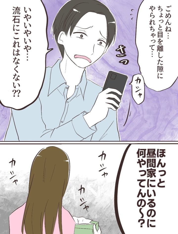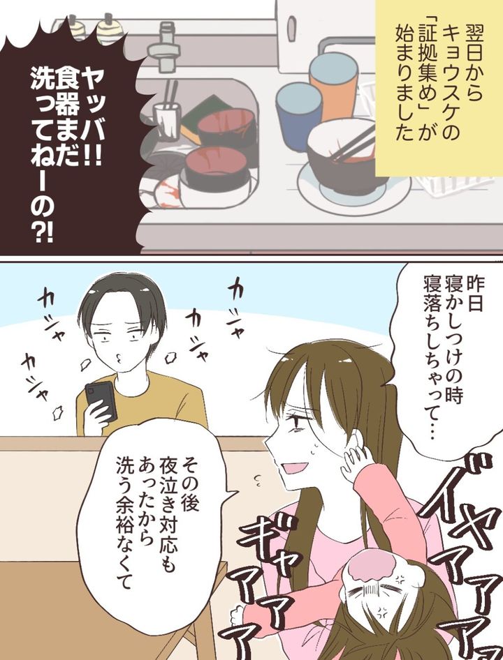 キョウスケさんの証拠集めが始まり、寝かしつけの時寝落ちしてしまい、洗えなかった食器をカシャカシャ。その後も、掃除に公園遊び、やっと帰って来ればもう夕方でご飯の支度・・と時間に追われるカホさんが目を離した隙にティッシュペーパーで遊ぶヒナちゃん。絶望しながら片付けているところに帰って来たキョウスケさんが「流石にこれはなくない?」とすかさずスマホで撮影。やめてと言ってもやめてくれず、「できてない証拠が揃ってるじゃん」と言われ、「だったら手伝ってよ!!」とカホさんが言うも、「え?やだよ。カホの仕事だろ?」と全くの他人事を決め込むキョウスケさん、今、全ママさん達を敵に回しましたよ。