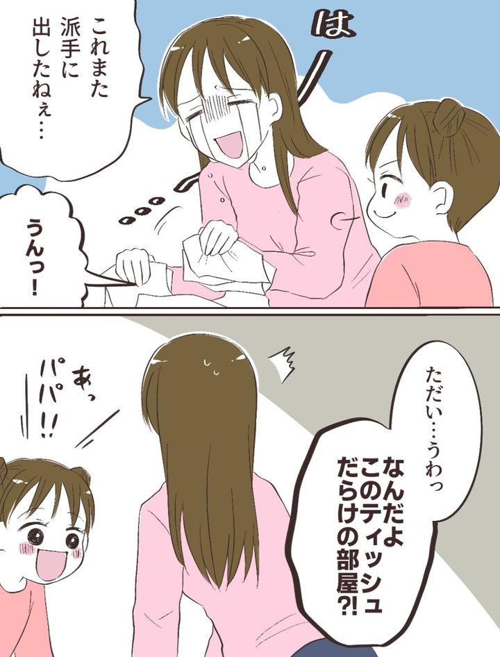 すると、「ただい・・うわっ、なんだよこのティッシュだらけの部屋!?」とキョウスケの声が!ヒナは「あっパパ!!」と嬉しそうだったものの、