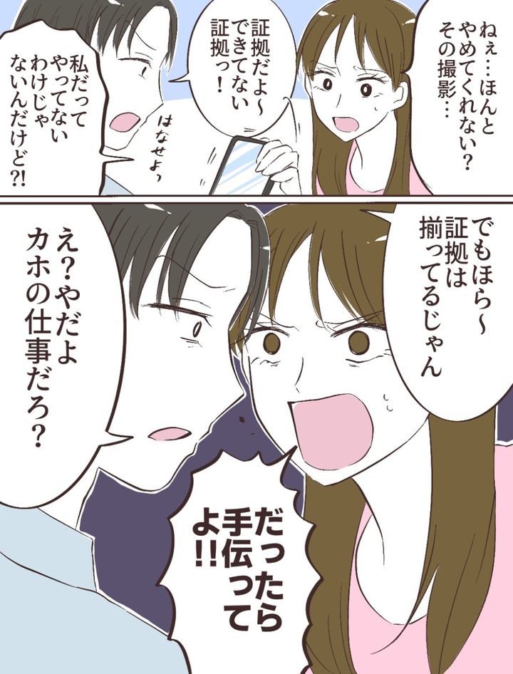 「ねぇ・・ほんとやめてくれない?その撮影・・」耐え切れずにそう言ってスマホを掴むと、「証拠だよ~。できてない証拠っ!」そう言いながら私の手を離そうとするキョウスケに、「私だってやってないわけじゃないんだけど!?」と言うと、「でもほら~、証拠は揃ってるじゃん」と言うキョウスケに、「だったら手伝ってよ!!」そう言うも、「え?やだよ。カホの仕事だろ?」と全く協力しようとしてくれませんでした。