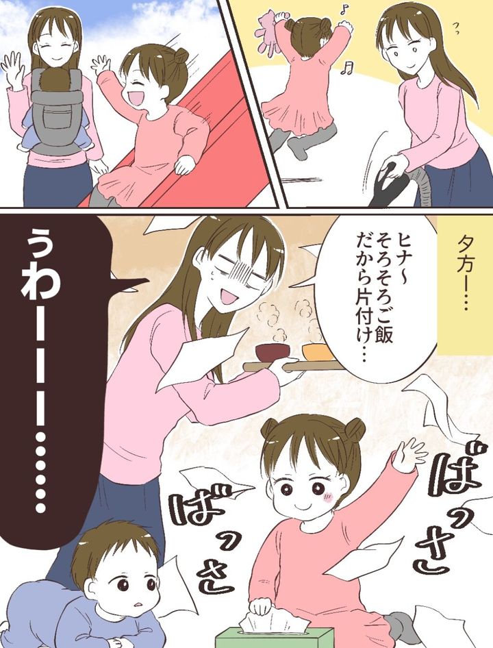 その後、掃除をして公園へ遊びに行き、やっと帰ってきて夕方は晩ご飯の支度を。「ヒナ~、そろそろご飯だから片付け・・・」と声をかけるも、ちょっと目を離した隙に、ティッシュペーパーをばっさばっさと抜き出してニコニコしているヒナ。「うわーーーーー・・」その様子を見て涙が出そうになりました。