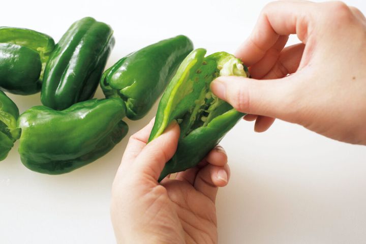 ・ピーマンは手でつぶし、割れ目から種を取り出す。