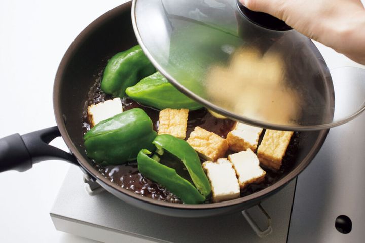 フライパンに〈煮汁〉の材料を入れて中火にかけ、厚揚げ、ピーマン、しょうがを入れる。煮立ったらふたをして弱火で8分煮る。火を止めて3分ほどおき、味をなじませる。