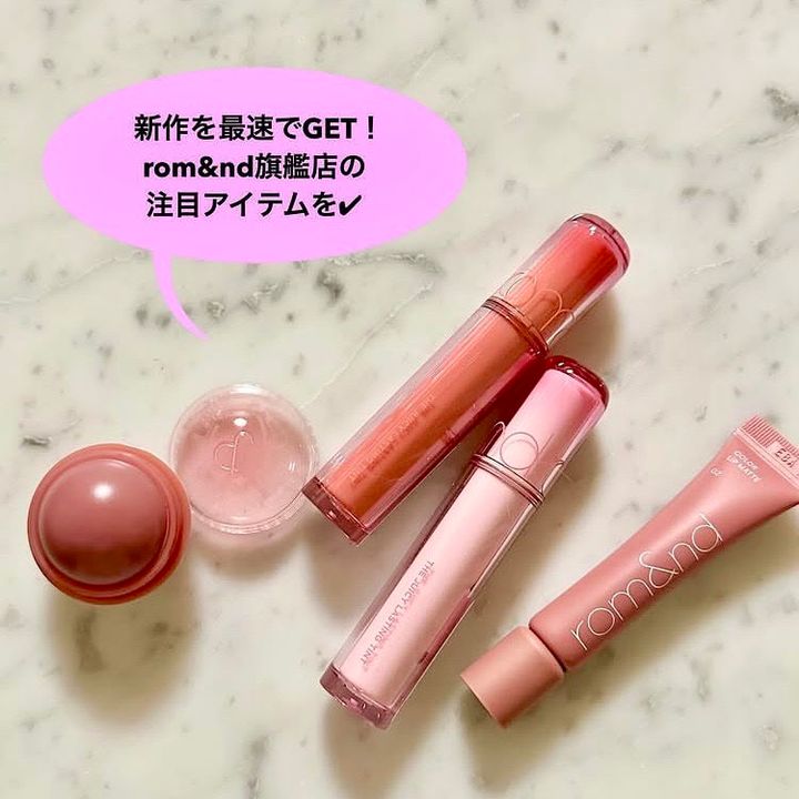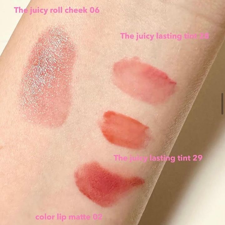 右から:カラーリップマット 全9色 ¥1,320、ザジューシーラスティングティント「レアシリーズ」全5色 ¥1,320、ザジューシーロールチーク 全6色¥1,430(ロムアンド)