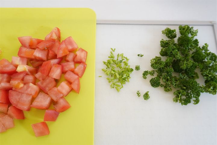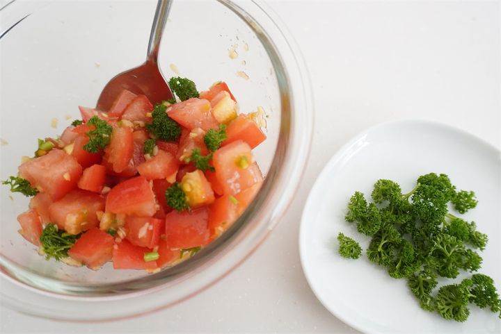 さっぱりしておいしいトマト酢ソースの完成です!パセリの葉は飾り用に少し取っておきました。