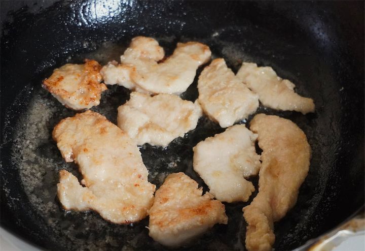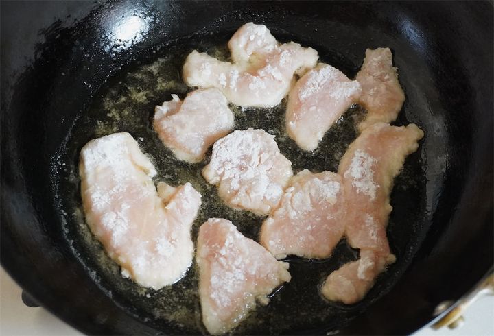 2. 1に片栗粉をまぶす。フライパンにこめ油を引いて鶏肉を入れ、中火で加熱する。