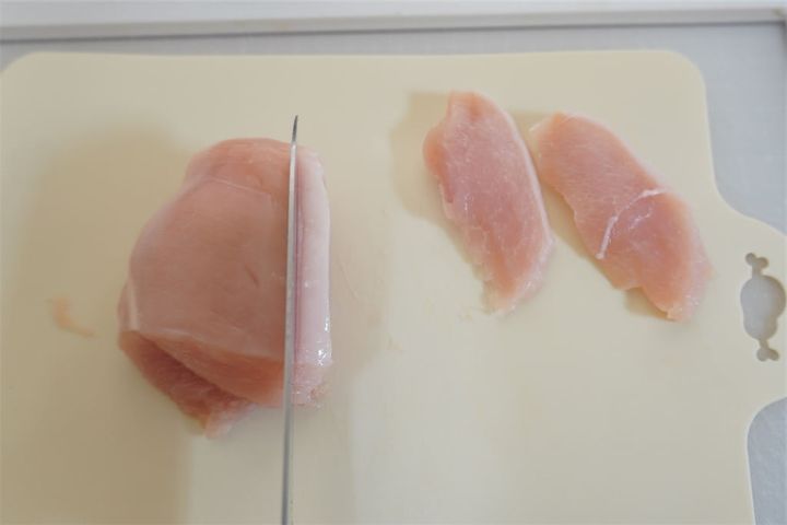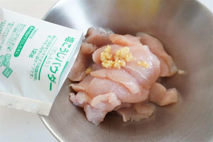 鶏むね肉は繊維を断つように切って「塩こうじパウダー」を揉みこむことでやわらかくなります。