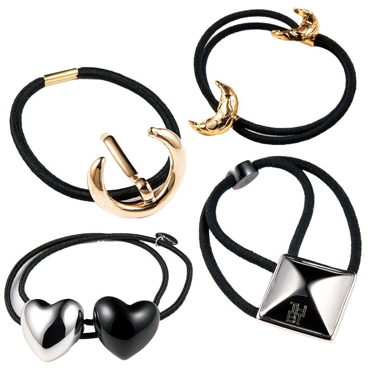 【左上/モデル着用】使いやすい細身のシンプルなデザイン。ヘアカフ[ヘアゴム付き]¥1,320(アネモネ/サンポークリエイト)【左下】シルバーとブラックハートが、甘さをプラスしたいときに最適。ハートヘアゴム[2個セット]¥1,760(アネモネ/サンポークリエイト)【右上】月モチーフが小ぶりで品よくまとまる。月ヘアゴム¥5,720(IRIS47/フーブス)【右下】クールな印象のスクエアモチーフ。シルバーヘアゴム¥13,200(ザ ヘア バー トウキョウ)