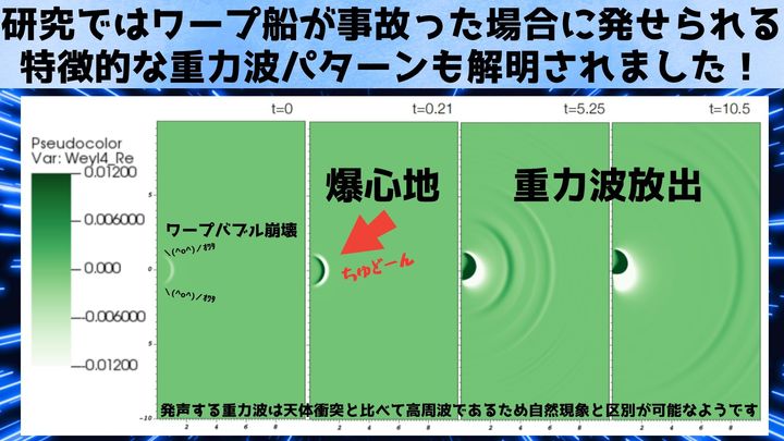 しかしワープバブルが制御を失い崩壊した場合、観測可能な重力波を放出する可能性があります。