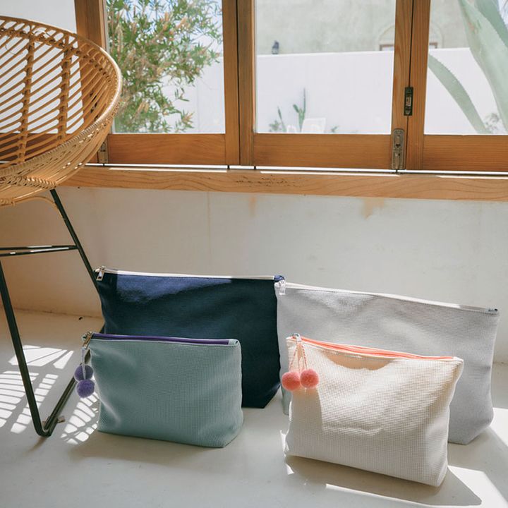 おむつやおしりふきが入るビッグポーチと、ポンポンニットの引き手が可愛いミニポーチのセット。大小ともに表情のあるワッフル素材を使用。