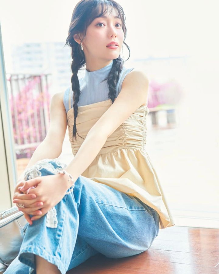 リボンデニムパンツは着回し。ブルーニットタンクトップ 5,940円/MERCURYDUO ルミネエスト新宿店 キャミソール(キャミソールとスカートのセット)22,000円/RANDA  イヤリング、バングル 各2,200円/GOLDY リング(右手)1,590円、リング(左手)950円/ともにNADIA FLORES EN EL CORAZON バッグ 11,510円/ヨミム(HANA KOREA)
