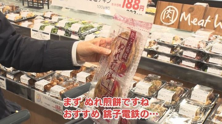 番組スタッフ:「千葉産のものってどんなものがあるか見せていただいてもいいですか?」奥様:「全然大丈夫です。まず“ぬれ煎餅”ですね、おすすめ。銚子電鉄の…」
