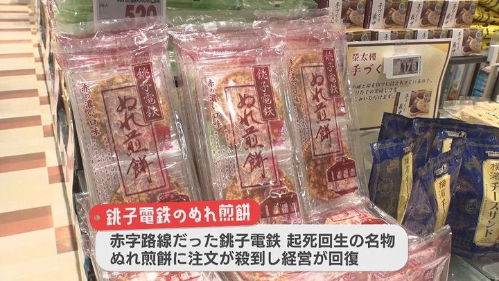 番組スタッフ:「銚子電鉄の濡れ煎餅って有名なんですか?」奥様:「有名ですよ。銚子電鉄、起死回生の、すごい赤字路線で考えたんでしょうね。駅でぬれ煎餅を売るようになって、全国的に有名で、いますごい売れてる。北海道では手に入らないと思うので…」