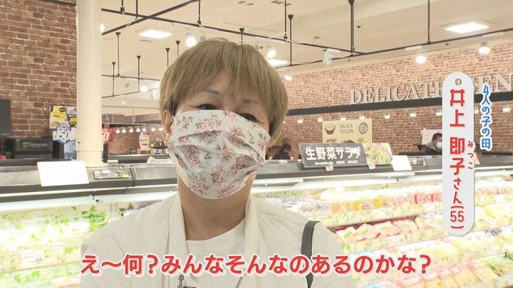 番組スタッフ:「どんなものをお買いになってるんですか?」即子さん:「お漬物と、息子の好きなシソの納豆。あと夜に、アスパラとブロッコリーを茹でて置いといて、明日カレーにしようかなと思って…」