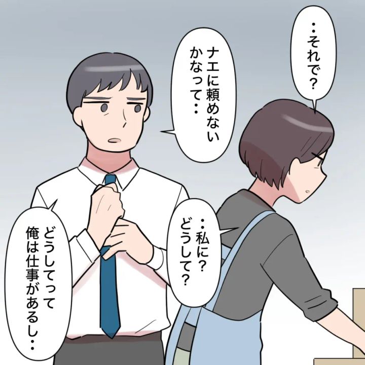 月日が流れたある日のこと、義母に義父の通院の付き添いと日常のお世話を告げられ、仕事があるからと断ったショウタが仕事の都合をつけると伝えると、「ナエさんに来てもらうとかできないの?」と義母は言いたい放題。「よくしてあげたんだから、こっちにお返しするのは筋」と義母に言われ、ショウタが帰宅した後、私に話すも無言でテーブルを拭いていました。