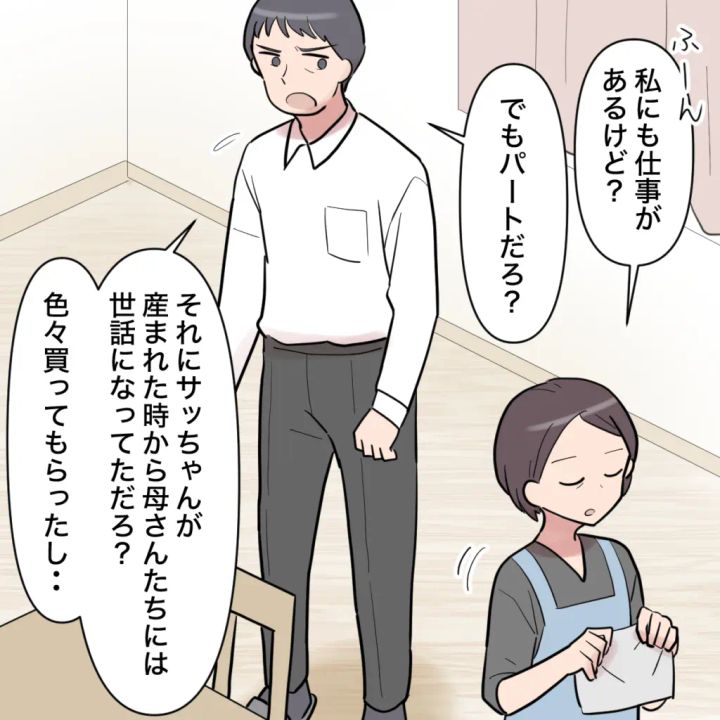 「ふーん。私にも仕事があるけど?」そう答えると、「でもパートだろ?それに、サッちゃんが産まれた時から、母さんたちには世話になってただろ?色々買ってもらったし・・」