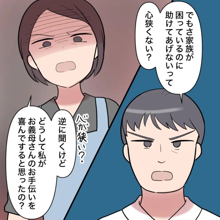 「でもさ、家族が困っているのに助けてあげないって心狭くない?」ショウタがそう言い、「心が狭い?逆に聞くけど、どうして私がお義母さんのお手伝いを喜んですると思ったの?」とショウタにたずねました。