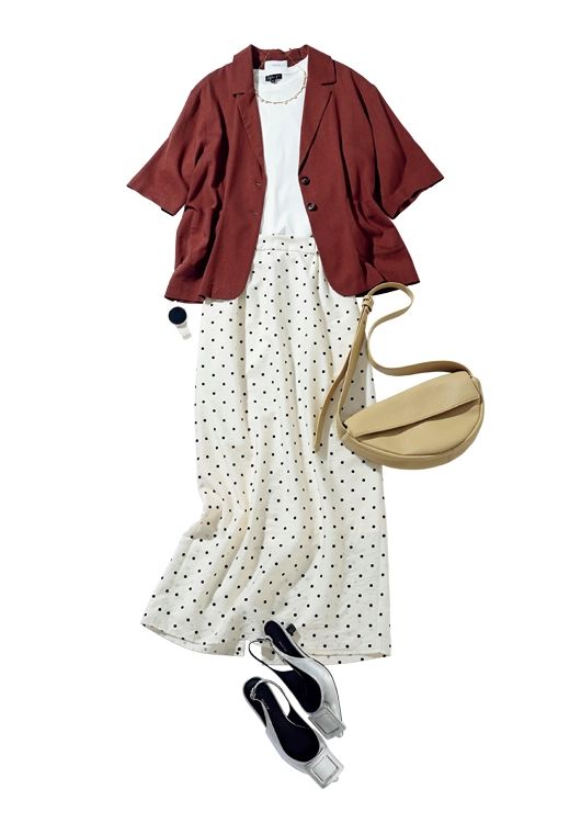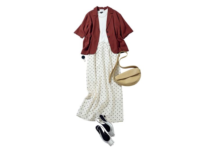 白Tシャツ¥5,490/インディヴィ(ワールド) ブラウンジャケット¥9,350/ラルータ(ナイスクラップ) キャミ&スカートセットアップ(スカート)¥15,400/31 Sons de mode(ダブルエー) ボディバッグ¥7,700/オリエンタルトラフィック(ダブルエー) シルバーパンプス¥22,000/アルネ セヴン トゥエルヴ サーティ(サン・トロペ) パールネックレス¥16,500/ステラハリウッド スマートウォッチvivoactive 6 ¥52,800/ガーミン