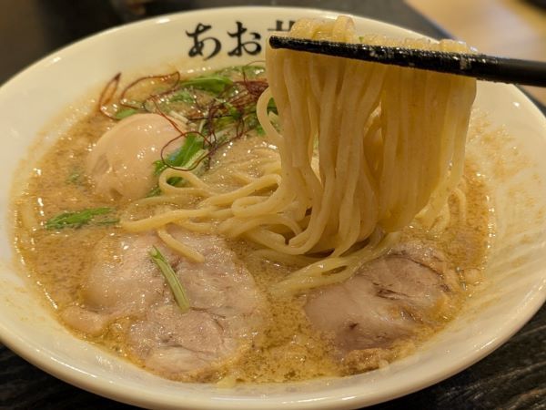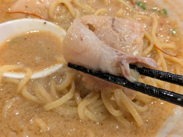 濃厚そうで背脂も浮いてて、たまらなく美味しそうだけれど、ちょっと背徳感も感じられるヘビーな見た目(笑)。今日はカロリーとか気にせずに、ガッツリ行っちゃおう!と決めてかかってスープを一口。あれ?濃厚なんだけど、しつこくなくて、食べられたような親しみのある味わいです。実は、すり潰した大豆をスープに入れ、味噌ダレに大量のすりゴマを入れているというのです。とろみを感じるくらいまでに、大豆とゴマが入っているなんて、なんてヘルシーなんでしょう!女性には特に嬉しい成分が入っている食材ですし、栄養満点ですよね。 このスープに合う麺を選んで製麵所から仕入れているそうで、スープが絡み合った中太の麺はこの上ない美味しさでした。