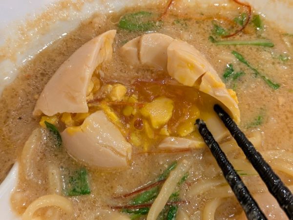 今回注文したのは「味噌」(890円)と「アウトレットたまご」(60円)。「アウトレットたまご」は形の崩れた玉子を使用しているので、「味噌たまご」(1000円)よりも50円お得に食べられるんです。数量限定で、帰り際に撮影した時は(上記の写真)売切れでした。 運ばれてきましたよ~。「とら食堂」と同じ方が考案したとは思えない味噌ラーメンのビジュアルにビックリ。