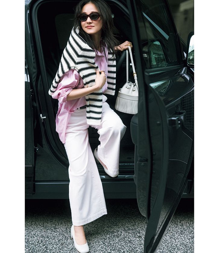 娘に「今日のママかわいいね!」と褒められることがあり、そう言われると素直に嬉しくて、もっと頑張ろうと思えます(笑)。普段はデニムスタイルが多い私ですが、最近惹かれているのがカラーデニム。カジュアル感が減らせるので油断ができない送迎時間にぴったりです。特に柔らかな印象のピンクは娘からの評判も良いので、トライできそう! 色の力で毎日の制服デニムに新鮮さと好感度をプラスして、送迎コーデの幅を広げたいです。(モデル・中越典子さん)