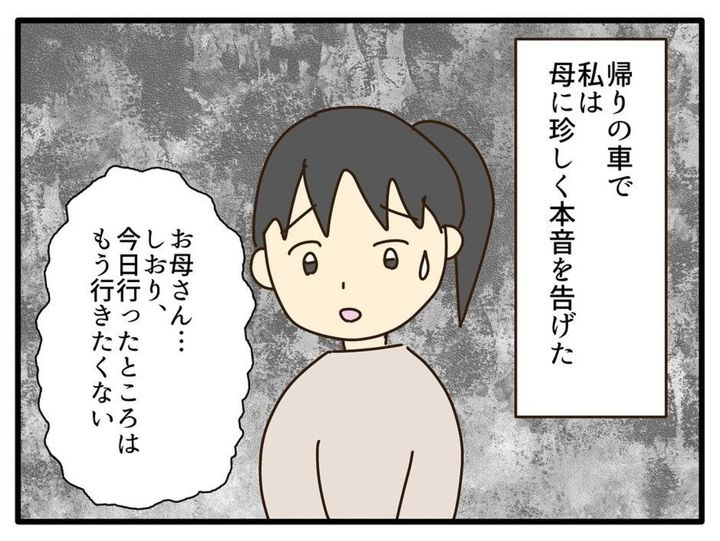 不倫相手との時間を楽しみたい母は、なんと自分が信じているわけでもない宗教の施設にしおりを預けるようにしました。しおりの母に「子どもの快適さ」を配慮する心はなかったのでしょうか…。それでも、この時はしおり自身の感覚で「もう行きたくない」と言えたのは良かったですね。