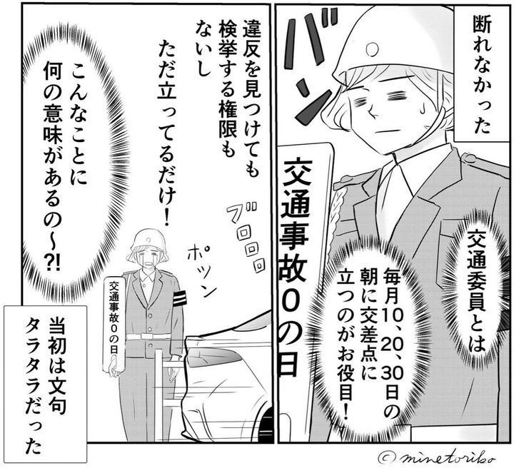 作者は、町内会の「交通委員」を断りきれずに引き受けることになってしまいました。その仕事は「朝、交差点に立っているだけ」で、引き受けた当初は意味があるのかと、不満を感じていました。しかし、続けていくうちに…。「交通当番」という役割のありがたさに、読者からは感謝や共感の声が上がっています。