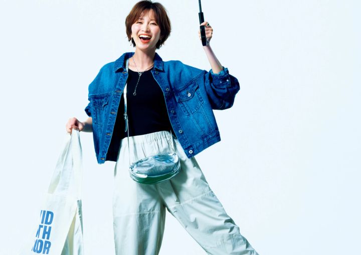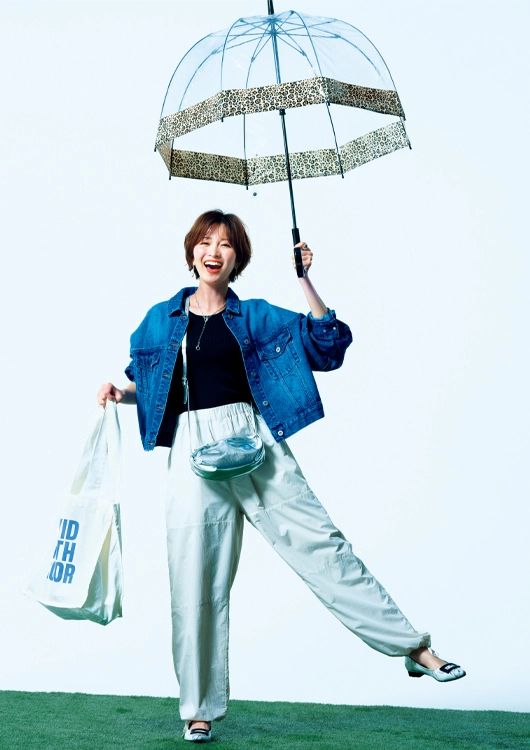 撥水パンツ¥28,600/ティッカ  Gジャン¥19,800/マイストラーダ リブタンク¥2,490/Isn't She? 傘¥6,600/フルトン(ムーンバット) ピアス¥33,000/プラウ ネックレス¥17,600、リング¥20,900/ともにココシュニック オンキッチュ(ココシュニック) ショルダーバッグ¥5,390/カシュカシュ(アンビリオン) トートバッグ¥8,800/MICA & DEAL(MICA & DEAL 恵比寿店) 撥水パンプス¥7,700/オリエンタルトラフィック(タブルエー)