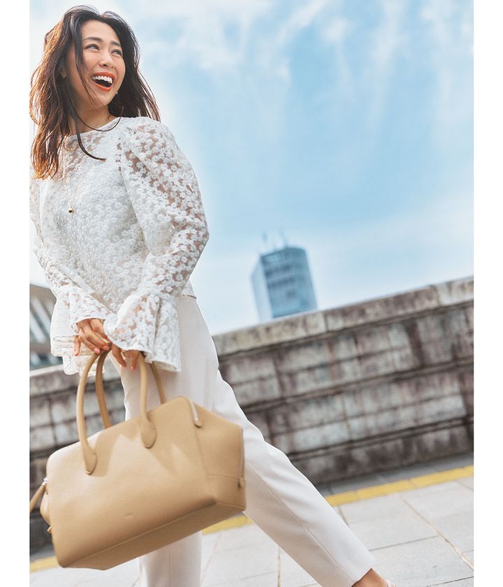 レースブラウス¥28,600(ウィム ガゼット/ウィム ガゼット 玉川髙島屋S・C店)タンクトップ¥9,900(エリオポール/エリオポール代官山)パンツ¥26,400(ヴェルメイユ パー イエナ/ヴェルメイユ パー イエナ 青山店)バッグ¥63,800(ヴァジック/ヴァジックジャパン)パンプス¥67,100(ネブローニ)ピアス¥107,800チェーンネックレス¥275,000ロングネックレス¥105,600(すべてココシュニック/ココシュニック)