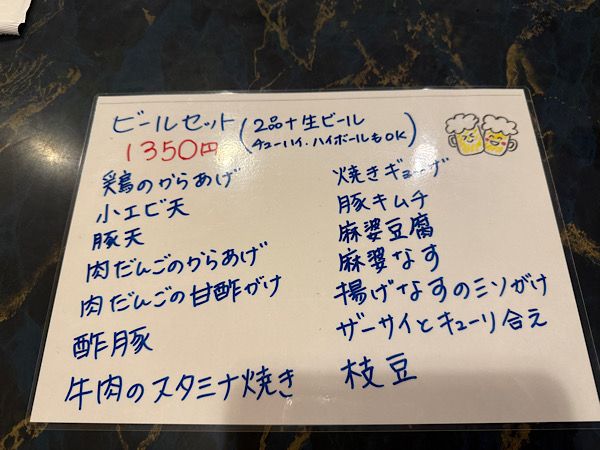 ビールセット(1350円)はとってもお得です。 生ビールに2品頼めます。ドリンクはチューハイ・ハイボールもOKです。 一人でこれもOK。大人数で行ってもこれがとってもいいんです。