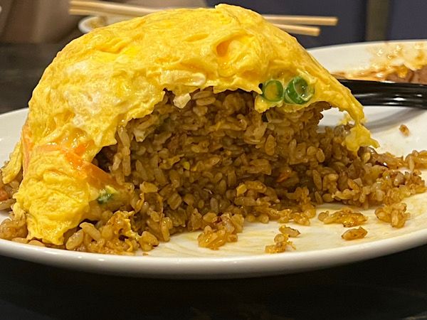 カレー味の焼き飯はスパイスが少し効いたドライカレー。ドライカレー焼き飯だけでもおいしいのに、たっぷりの卵が相まって次の一口へとかき立てます。