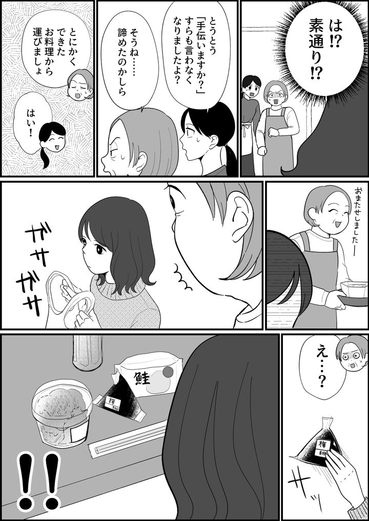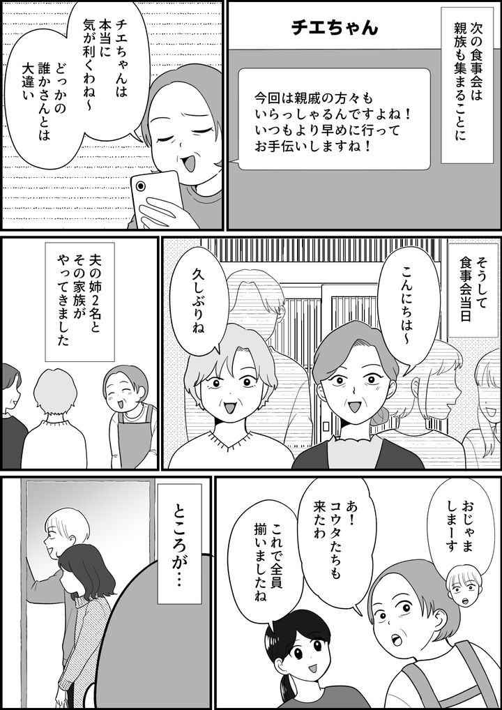 そうして当日。私たちはいつも通りキッチンで食事を作っていました。今日は夫側のお義姉さん2名とその家族もやってきて、一緒に飲み食いをしていました。そんななか、マユさんは今日は「手伝いましょうか?」の言葉もないまま、キッチンをスルーしていったのです。