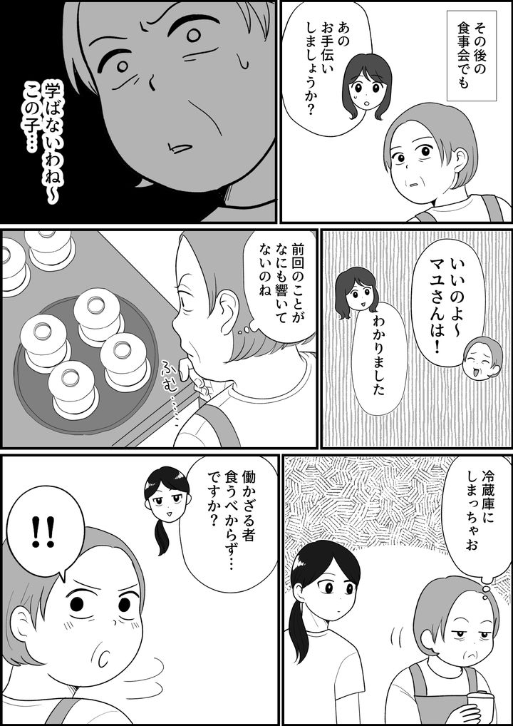 私(義母)は、夫と2人暮らし。2人の息子はそれぞれ自立をし、家庭を持っています。次男のヨウスケは嫁のチエちゃんと、孫のユウナちゃんとの3人暮らしです。ユウナちゃんは目に入れても痛くないほど可愛いし、チエちゃんはとても明るく気が利く子。一方で長男のコウタは2年前に結婚。嫁のマユさんはどうやら仕事はできるタイプの女性のようですが、愛想はまったくありません。わが家に来ても「手伝いましょうか?」と聞いてくるだけで、一度断ると何もせず座っているだけです。その姿勢が腹だたしくて仕方ありません。だから、働かざる者食うべからずの精神を教えてあげようと思ったのです!