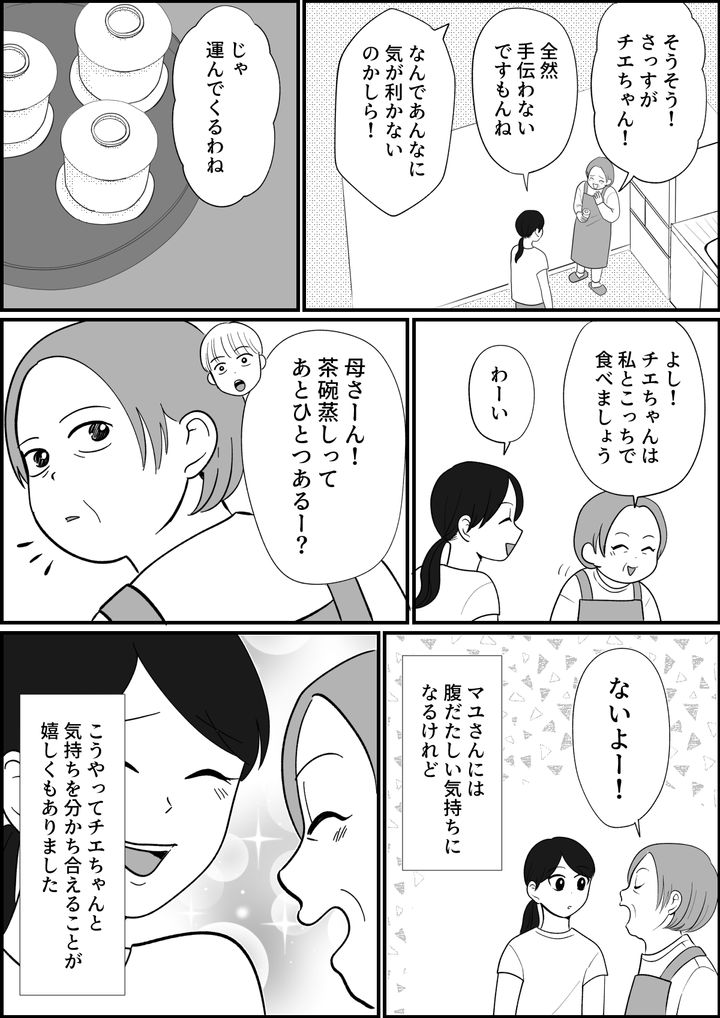 その後の食事会でも、マユさんは相変わらずでした。手伝いをしないことがどういうことなのか分からせるために、マユさんの分だけ茶碗蒸しを出しませんでした。チエちゃんと顔を見合わせて舌を出して笑いました。こうやってチエちゃんと気持ちを分かち合えることが嬉しくて、マユさんの存在がチエちゃんとの絆を強くしてくれているように感じます。