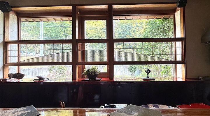 メインダイニング。カウンター6席のみ。新緑の美しい景色が見えて、素敵です