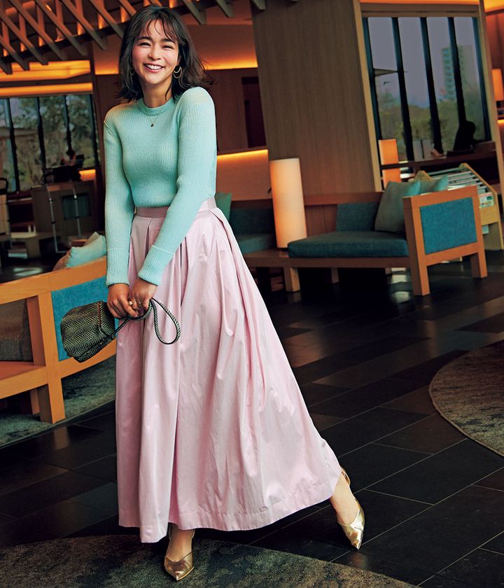 「男の子ママということもあり、普段は断然パンツ派、今まではたまに穿くスカートもなんとなく黒を選んでいました。ほんのりシャイニーなピンクのスカートが女子会気分をUP、ミントグリーンとの合わせも新鮮です」。